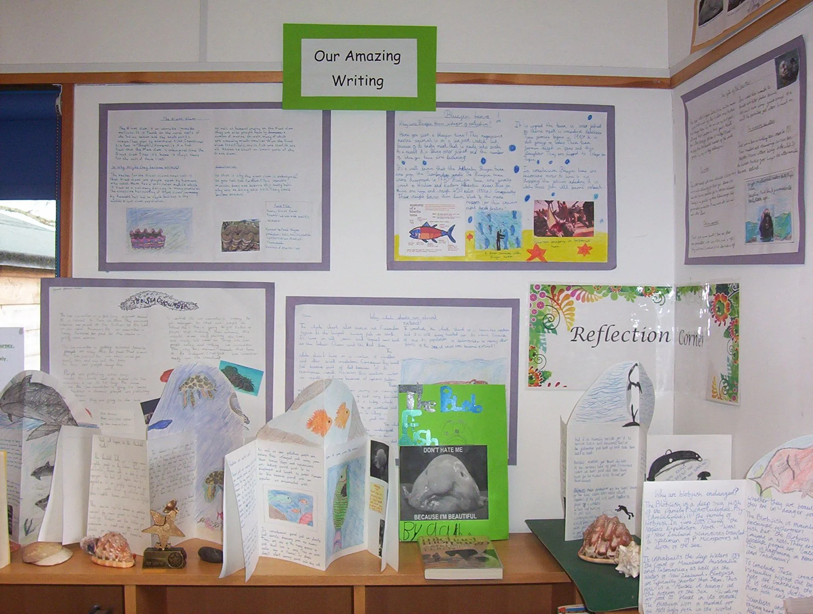 Classroom display titled 'Our Amazing Writing' showcasing student projects, creative writing, illustrations, and reflections on various topics, with a section labeled 'Reflection Corner'.